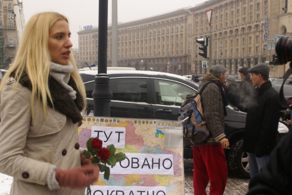 Через дорогу на углу улицы Институтской и Крещатика собралась другая группа людей. Это участники общественной кампании "Новый гражданин". На стол положили текст обращения украинских граждан в знак протеста против разгона палаточного городка и принятие Налогового кодекса. У стола поставили карту Украины с надписью "Здесь похоронена демократия".