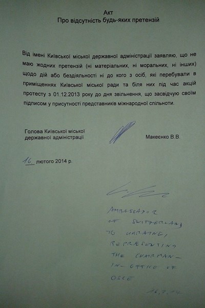 Комендант КГГА Руслан Андрийко и представитель ОБСЕ посол Швейцарии Кристиан Шененбергер подписали акт о передаче здания под контроль ОБСЕ.