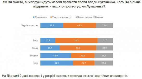 Если на западе и в центре больше тех, кто на стороне протестующих, то на юге и востоке Украины большинство высказалось в поддержку Лукашенко. Об этом свидетельствуют результаты опроса Киевского международного института социологии.