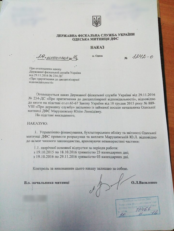 14 ноября Юлия Марушевская написала заявление об увольнении с должности руководителя Одесской таможни. Глава Государственной фискальной службы Роман Насиров ее не принял.