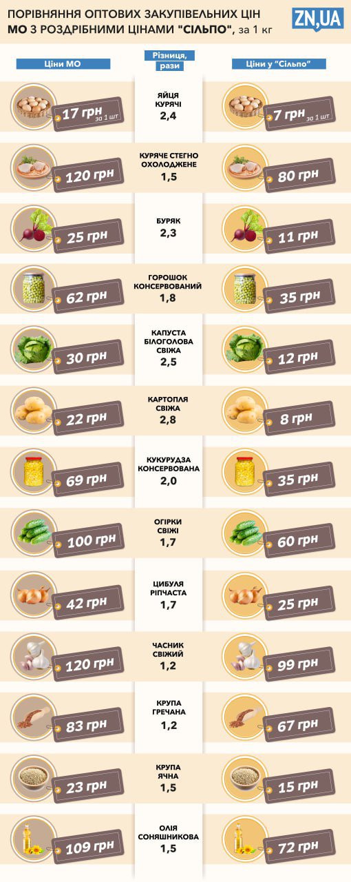 Также более чем вдвое переоценена картошка – 22 гривны за кг (по сравнению с 8-9 гривнами в "Сільпо"). Куриное бедро для военных оценено в 120 гривен за кг, магазинная цена – 80 грн.