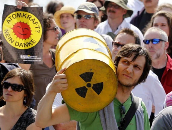 В руках протестующие развевались украинские и японские флаги. В знак памяти о погибших в результате страшных аварий в воды Рейна были брошены сотни цветов.