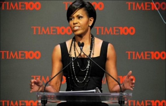 Первой леди тщательнейшим образом уложили волосы на затылке, а лоб прикрывала стильная челка. В таком образе Мишель выглядела очень модно и ничем не уступала звездной тусовке. Завершало образ супруги американского президента украшение из бисера.