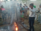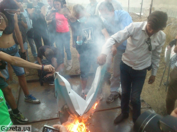 Через несколько секунд срывают с петель металлические ворота, затем хватают информационный щит с информацией о возможном строительстве. Пробуют поджечь его, но он не горит. Тогда откуда-то достают газеты и все-таки поджигают щит. У всех на лицах радость.