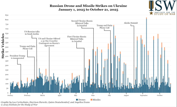 "Начиная с 2022 года, РФ каждую осень и зиму наносит серию усиленных ударов по украинской энергетической инфраструктуре. Это является попыткой России ухудшить энергетическую безопасность и промышленный потенциал Украины, а также деморализовать украинское население. Длительная и постоянно усиливающаяся кампания дальнобойных ударов Кремля против Украины является лишь одним из показателей незаинтересованности Москвы в мире", - отметили в ISW.