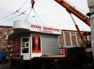 Зачіпляють краном магазин із написом "Взуття". З іншого боку вулиці під"їжджає ще один кран, готують до демонтажу кіоск, що торгує меблями. Там заїло двері – продавець не може вийти. Йому допомогли дві жінки, своїми ключами покрутили в замку – двері відчинились.