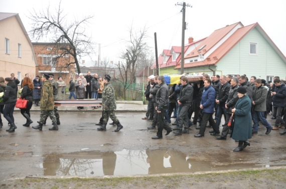 23 февраля в городе Старый Самбор, что в 110 километрах от Львова, похоронили 29-летнего Богдана Сольчаника. 20 февраля его убил снайпер выстрелом в шею на киевском Евромайдане. Накануне с погибшим прощались во Львовском Гарнизонном храме Петра и Павла во Львове. Открытый гроб несут собратья покойного в камуфляжной одежде. Восьмитысячная толпа выкрикивает "Герои не умирают!" и "Смерть врагам!".