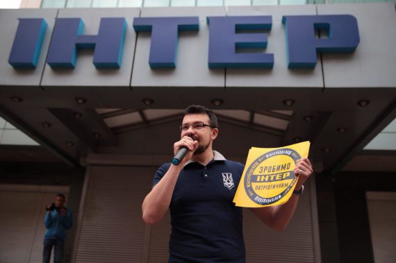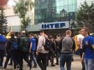 Представители Национального корпуса и Национальных дружин пришли к зданию телеканала "Интер" и требуют лишить канал лицензии из-за "системную антиукраинскую редакционную политику".
