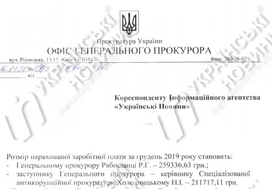 При этом неизвестно, какую сумму получил Рябошапка после удержания налогов и сборов. Издание получило официальное подтверждение информации от Генпрокуратуры и опубликовало документ.