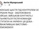 "Украинское Счастье (населенный пункт в Луганской области. - Gazeta.ua) под контролем ВСУ. Сбербанк Раши заблокирован. Российские военные бунтуют и увольняются после команды наступать на Украину. Эти сутки самые важные! Выстоим - победим!" - написал в Facebook шоумен Антин Мухарский.