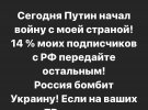 "Сегодня Путин начал войну с моей страной. 14% моих подписчиков - из РФ. Передайте остальным - Россия бомбит Украину. ТВ этого не показывает!", - написала они по-русски в Instagram.