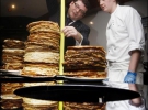 В Глазго, Шотландия, кулинары решили превзойти друг друга в высоте стопки блинов. Также они мечтали побить мировой рекорд и попасть в книгу рекордов Гиннесса. На одну попытку одним участником было потрачено 100 яиц, 5 кг муки и 3 кг сливочного масла.