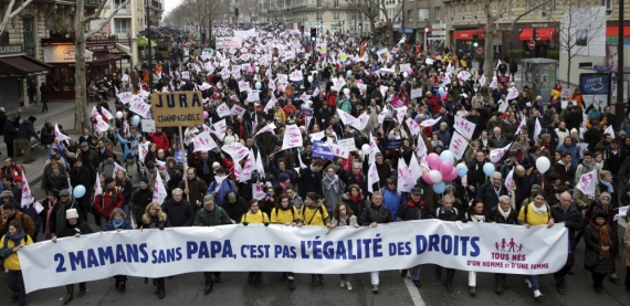 В воскресенье около 10 тысяч человек вышли на улицы Парижа по призыву католического института Civitas. В демонстрации приняли участие целые семьи под лозунгами "Один папа, одна мама для всех детей" и "Нет гомобезумию".