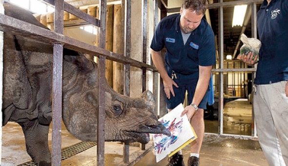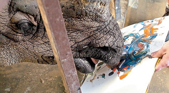 Носорога по кличке Мечи считают одним из самых крупных современных художников. Спорить здесь трудно - в этом самобытном живописце полторы тонны веса.