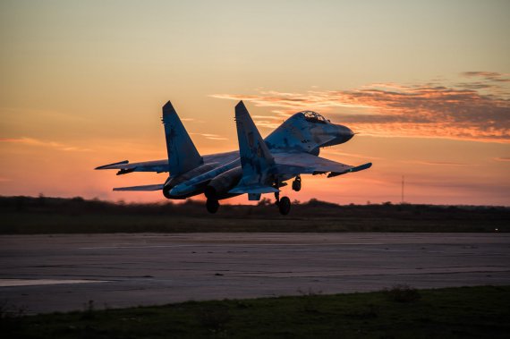 Украинские истребители Су-27 отработали взлет-посадку на автомобильной трассе Киев-Чоп.