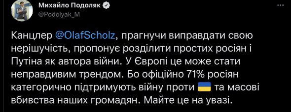 "Олаф Шольц, пытаясь оправдать свою нерешительность, предлагает разделить простых россиян и Путина (как автора войны). Это может стать ложной тенденцией для Европы. Потому как официально, 71 процент россиян поддерживают войну и массовые убийства украинцев. Имейте это в виду", – написал Подоляк.