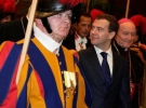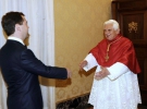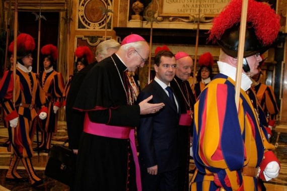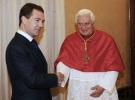 Президент РФ Дмитрий Медведев завершил краткий рабочий визит в Ватикан, в ходе которого побывал на аудиенции у Папы Римского Бенедикта Шестнадцатого и сообщил, что подписал указ об установлении дипломатических отношений между Россией и Ватиканом на уровне посольств, а не постоянных представительств, как было ранее.