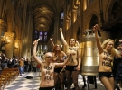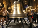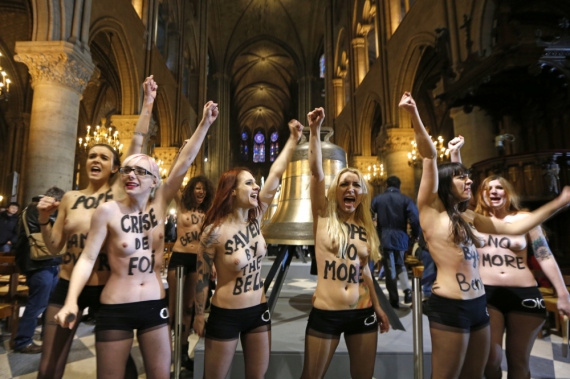 Смешавшись с туристами, восемь активисток движения проникли в неф собора, где в феврале выставляются девять новых колоколов Нотр-Дам-де-Пари, установка которых ожидается в конце месяца. Скинув длинные пальто, полуобнаженные женщины принялись палками колотить в колокола, выкрикивая на английском: "Папы больше нет!".