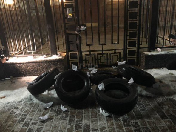 Также к центральному входу принесли шины и лодочки из бумаги.