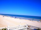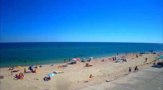 На центральном пляже азовского курорта можно насчитать не более двух десятков людей. В последние дни на море установился полный штиль, а температура воды комфортная для купания - + 23°C.
