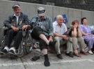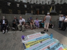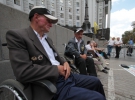 Под стенами Кабинета министров - с десяток людей. У пятерых из них на головах повязки с надписью "голод". Они сидят на мягких стульчиках, двое - в инвалидных колясках.