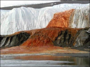 Необычные ледяные водопады красного цвета полярники нашли еще в 1911 году. В середине прошлого века ученые установили, что цвет потоку придает содержащееся во льду железо. Вода, как оказалось, поступает наружу из древнего соленого озера.