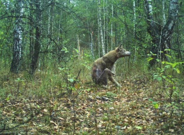 На территории Чернобыльской зоны в объектив фотоловушки попал больной волк. Животное болеет демодекозом - повышенным размножением подкожного клеща.