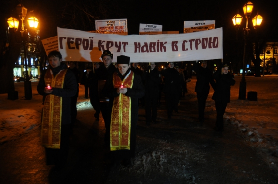 От оперного театра они прошлись торжественным шествием к памятнику Тарасу Шевченко. В колонне было по трое лицеистов. Каждый в руке нес зажженную лампадку. Впереди шел капеллан лицея. Некоторые из воспитанников несли в руках плакаты, в которых призывали помнить героев Крут. Также к ним по дороге присоединялись школьники. Возле монумента Шевченко лицеисты выложили из свечей "Слава героям Крут".