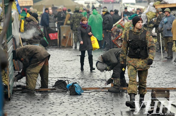 Выше, за баррикадами майдановцев, стоят бойцы внутренних войск. Они развернули армейские палатки возле Художественного музея. Там находится около двухсот ВВшникив.