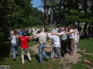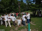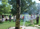 На празднике собралось около двадцати верующих в национальных украинских вышиванках. Становятся в замкнутый круг, поднимают руки вверх и начинают славить древнего бога.