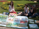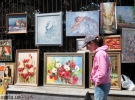 Около двух часов покупателей возле торговых палаток немного. Большинство слушают выступление индийской группы и рассматривают картины.