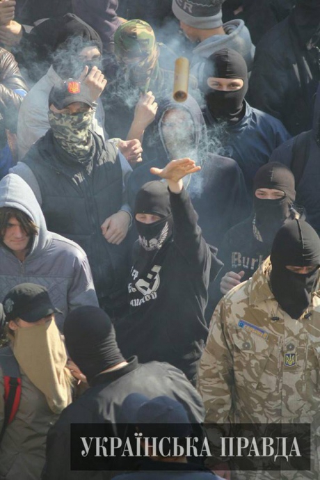 Провокаторы смешались с мирными митингующими и начали атаковать милиционеров дымовыми шашками и дубинками. Кроме того, люди в масках забрасывали и обстреливали здание Рады, повредив при этом стекла.