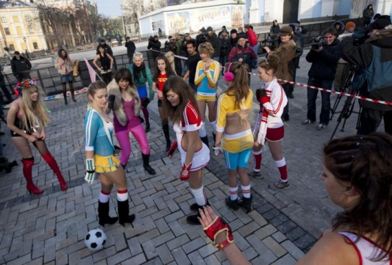 Активистки FEMEN сыграли в футбол в центре столицы. Сексапильная сборная Украины и Польши сразилась с командой проституток за главенство на предстоящем чемпионате Евро 2012. После матча девушки представили свой логотип Евро 2012 – девушка в национальном венке с мячом в руках, окруженная кольцом защиты.