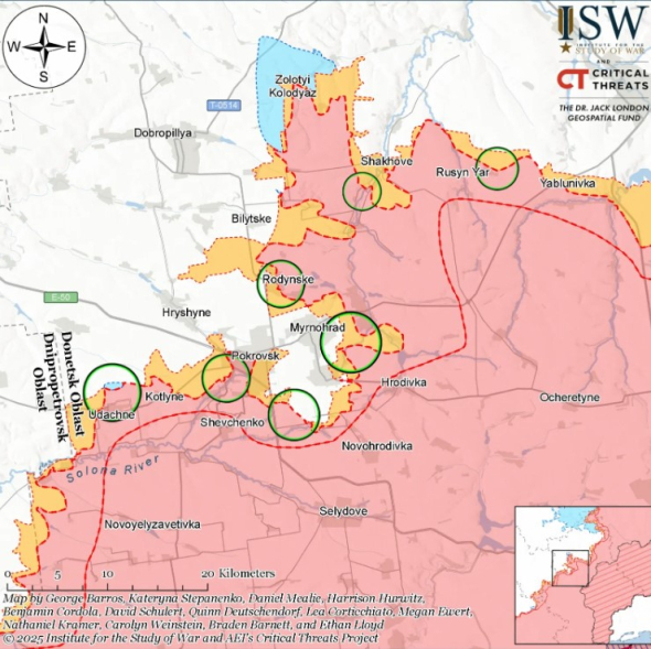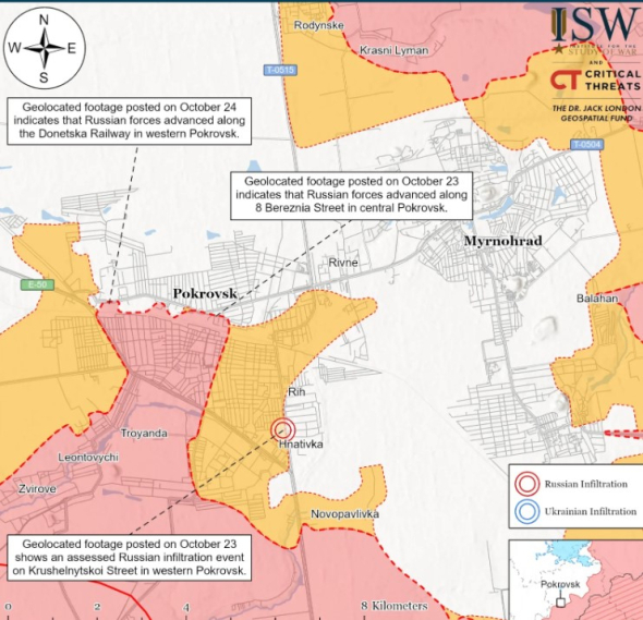 Также аналитики сообщают о российских атаках на Мирноград (к востоку от Покровска) и констатируют, что пока украинским военным удается защищать город от российского продвижения.