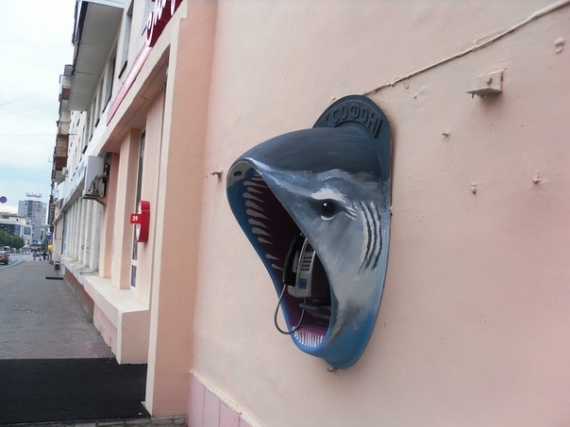 Уличный художник Александр Жунев, раскрасив таксофоны, превратил их в рыб с открытой пастью. Сначала у художника получилось три "рыбофона": окунь, зеркальный карп и акула.