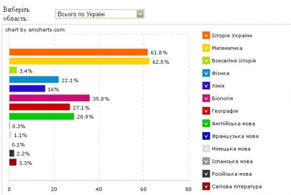 Если же смотреть на географию популярности ВНО, то наибольший спрос на прохождение внешнего независимого оценивания по математике зафиксирован в Харьковской области - 71.8%, истории Украины в Черниговской - 67.0%, всемирной истории в Киеве - 5.4%, физики в Севастополе-31.3%, химии в Ивано-Франковской и Сумской областях - 18.5%, биологии в Житомирской области - 45.8%, географии в Тернопольской области - 35,9%, английского языка в Киеве - 50.3%, мировой литературы в Херсонской и Николаевской областях - 4,9%, русского языка в АР Крым - 8,7% и других иностранных языков (французского, немецкого и испанского) в Черновицкой области на уровне - 5.6%.