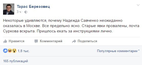 "Некоторые удивляются, почему Надежда Савченко неожиданно оказалась в Москве. Все предельно ясно. Старые явки провалены, почта Суркова вскрыта. Пришлось ехать за инструкциями лично", - отмечает в соцсети Тарас Березовец.