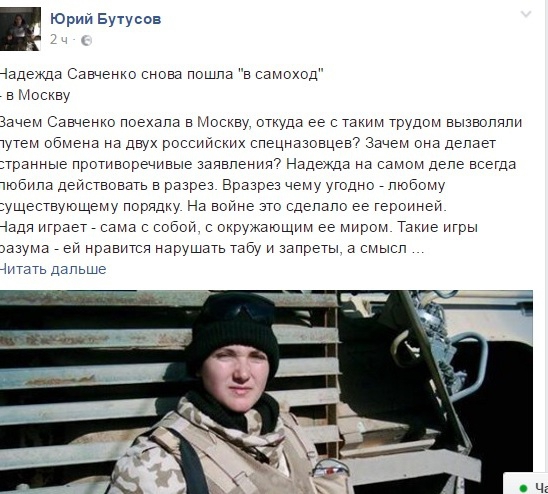 "Надежда Савченко снова пошла "в самоход" - в Москву. Зачем Савченко поехала в Москву, откуда ее с таким трудом вызволяли путем обмена на двух российских спецназовцев? - пишет в Facebook Юрий Бутусов. - Зачем она делает странные противоречивые заявления? Надежда на самом деле всегда любила действовать вразрез. Вразрез чему угодно - любому существующему порядку. На войне это сделало ее героиней. Надя играет - сама с собой, с окружающим ее миром. Такие игры разума - ей нравится нарушать табу и запреты, а смысл действий она находит далеко не всегда. Кому она доверяет, кто ей близок, того и слушает.
