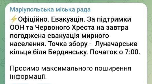 Эвакуация состоится при поддержке ООН и Красного Креста, сообщает Мариупольский горсовет.