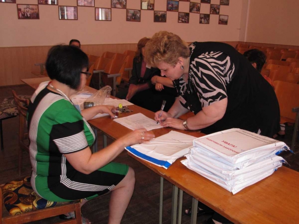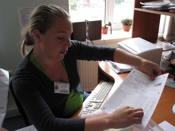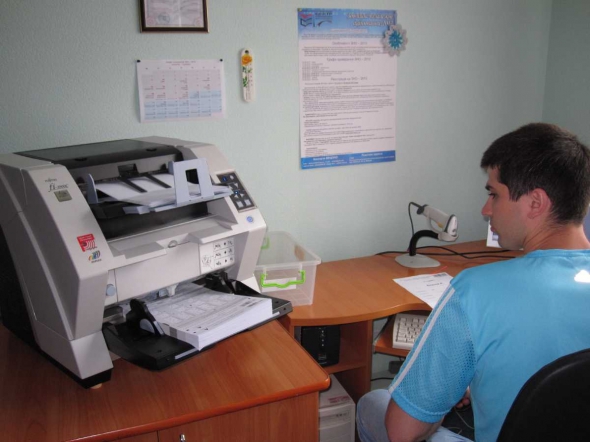 В большой прямоугольной комнате восемь столов и шкафчики для документов. На столах компьютеры и сканеры, светящиеся красной лазерной полоской. За столами сидят по двое. Один работник распаковывает конверт, пересчитывает бланки, сверяет с протоколом и вносит данные в компьютер. Другой следит за его работой. Потом меняются местами.