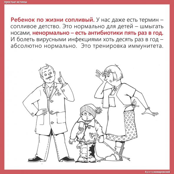 "Ребенок соплив по жизни. У нас даже есть термин — сопливое детство. Это нормально для детей — шмыгать носами, ненормально — есть антибиотики 5 раз в год. И болеть вирусными инфекциями хоть 10 раз в год — абсолютно нормально. Эта тренировка иммунитета", - написал Комаровский.