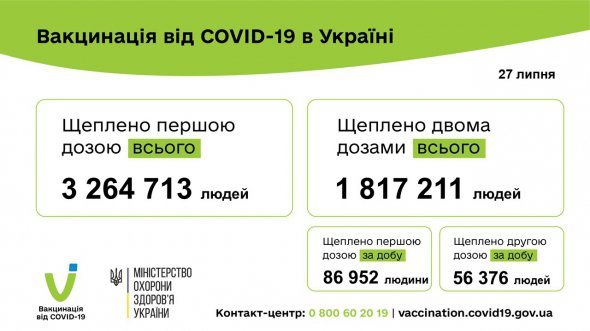"27 июля одну дозу Covid-вакцины получили 86 952 человека. Полностью иммунизировали 56 376 человек. Работали 829 мобильных бригад, 2666 пунктов прививки и 360 центров вакцинации", - говорится в сообщении.