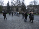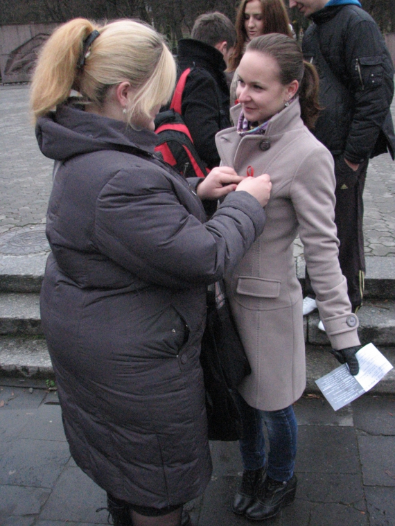 Около десяти человек в центре города, напротив главного корпуса университета имени Ивана Франко раздавали прохожим красные ленточки в виде бантика и листовки с информацией о СПИДе.