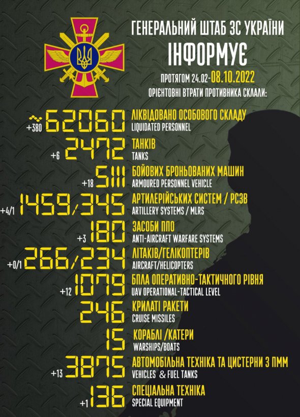 Общие боевые потери России на утро 8 октября составляют 62 060 человек.