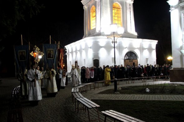 Затем люди выстраиваются, впереди несут хоругвы и крест. Далее следуют священники. За ними - благочинные и все прихожане. Идут вокруг храма против часовой стрелки. Таким образом община символизирует женщин мироносиц, апостолов, которые рано утром до рассвета пришли к могиле Исуса. В это время храм символизирует гроб.
