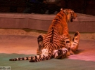 Новая программа открывает "Аттракцион хищных зверей" под руководством Юлии и Николая Козырева. В нем принимают участие 2 льва, 4 львицы и 4 тигры.