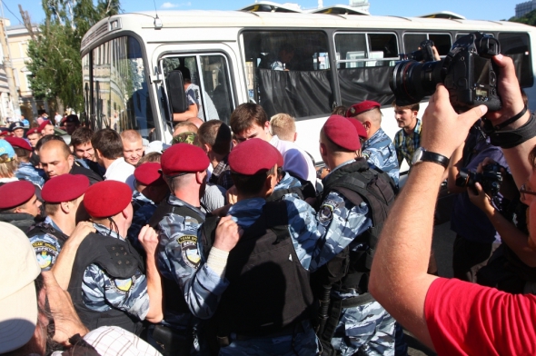 Время от времени между ними происходили столкновения. В конце концов, одного из "свободовцев" задержали правоохранители. Противники "Свободы" ушли с места событий, тогда как "свободовцы" начали "отбивать" у правоохранителей своего товарища. В результате возникла драка. Задержали 8 сторонников "Свободы". Пикет "свободовцев" перебрался под райотдел, куда привезли задержанных. Через несколько часов их отпустили.