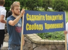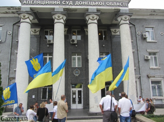 Активисты ВО "Свобода" из нескольких городов Донетчины пикетировали суд, требуя освободить "тризубовца". Они считают его политическим узником. Пикетчики держали плакаты: "Суддя, схаменися! Свободу невинному!" и "Саджайте бандитів! Свободу Применку!".