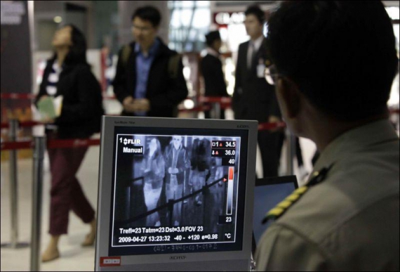 В связи с невероятно быстрым распространением по миру свиного гриппа H1N1 во многих аэропортах были установлении специальные пропускные пункты, с помощью которых можно установить имеет ли человек повышенную температуру.
