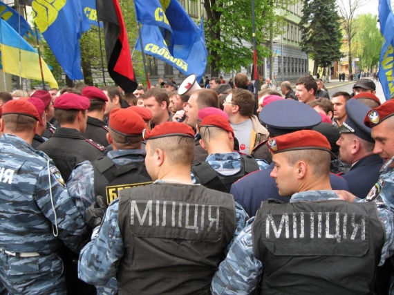 "Свободовцы" также намеревались отправиться колонной на Мемориальное кладбище, однако представители спецподразделений "Беркут" и "Грифон" перекрыли им путь.